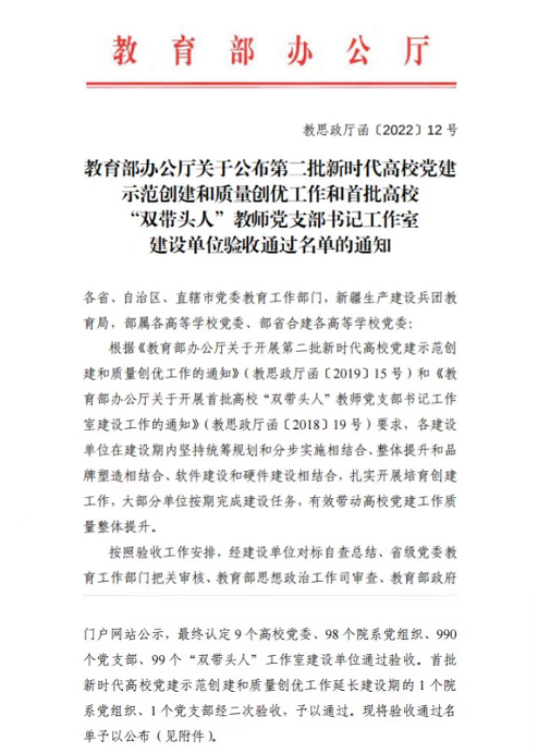 日前,教育部办公厅发布全国第二批新时代高校党建示范创建和质量创优工作和首批高校“双带头人”教师党支部书记工作室建设单位验收通过名单,我校太阳集团网站8722教工党支部顺利通过验收。