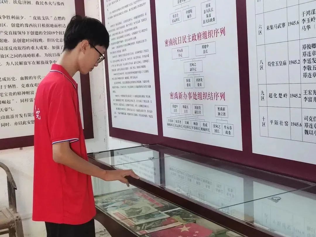 7月15日,实践团队队员去往河南省新密市中原豫西抗日纪念馆,1944年7月,党中央决定开辟豫西抗日根据地,1944年12月,“皮徐支队”攻克尖山地区,红旗插上田种湾,密北抗日民主政府成立,创建的豫西抗日根据地面积达2万多平方公里,是中国共产党直接领导下创建的全国19个抗日根据地之一。实践队员参观了纪念馆内陈列的革命物件,阅读学习纪念馆内中原豫西抗日根据地发生的革命历史事件。