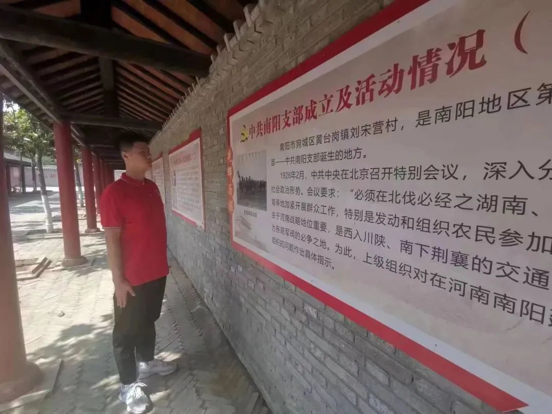 7月8日,实践队员去往河南省南阳市宛城区的中共南阳第一支部旧址,中共南阳第一支部位于宛城区黄台岗镇刘宋营村。1926年5月,中共党员刘友三、杨士颖等在南阳县刘宋营村秘密成立中共南阳支部。这是南阳地区建立的第一个党支部。实践团队成员在星火燎原石碑处瞻仰石碑,充分了解了中共南阳第一支部的建立遗址的介绍由来。在经过通道时,实践团成员认真阅读了中国共产党的党史以及中共南阳支部成立及活动情况。