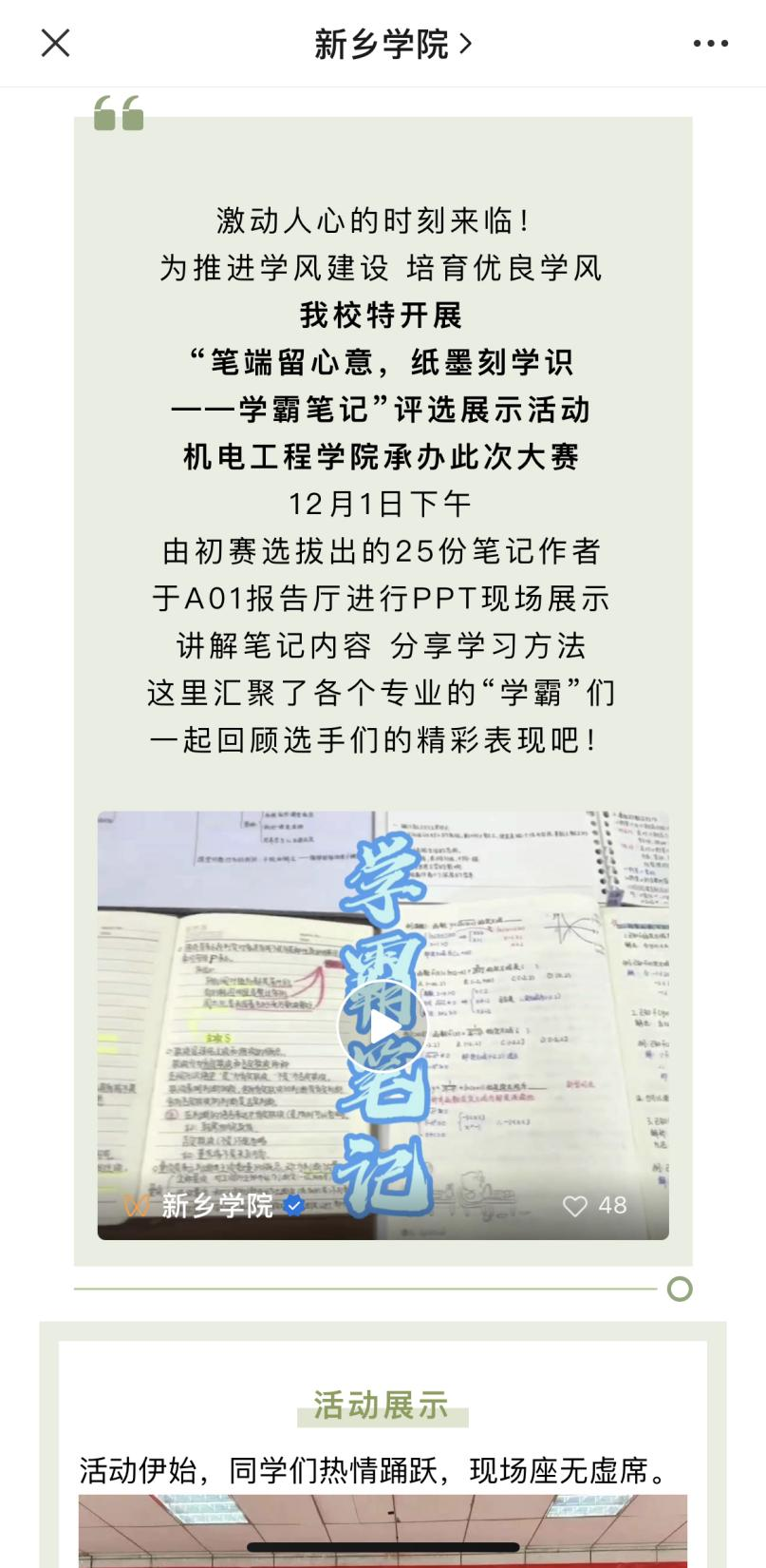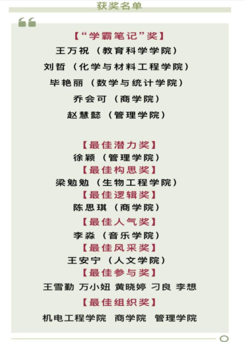 经过评委现场打分,评选出10名同学的笔记作品并通过微信公众号展示的方式由全校学生投票,结合线下打分和线上投票,最终评定出“学霸笔记” 5 名和最佳人气奖、最佳构思奖、最佳逻辑奖、最佳风采奖、最佳潜力奖各 1 名,最佳参与奖5名,最佳组织奖 3 个。