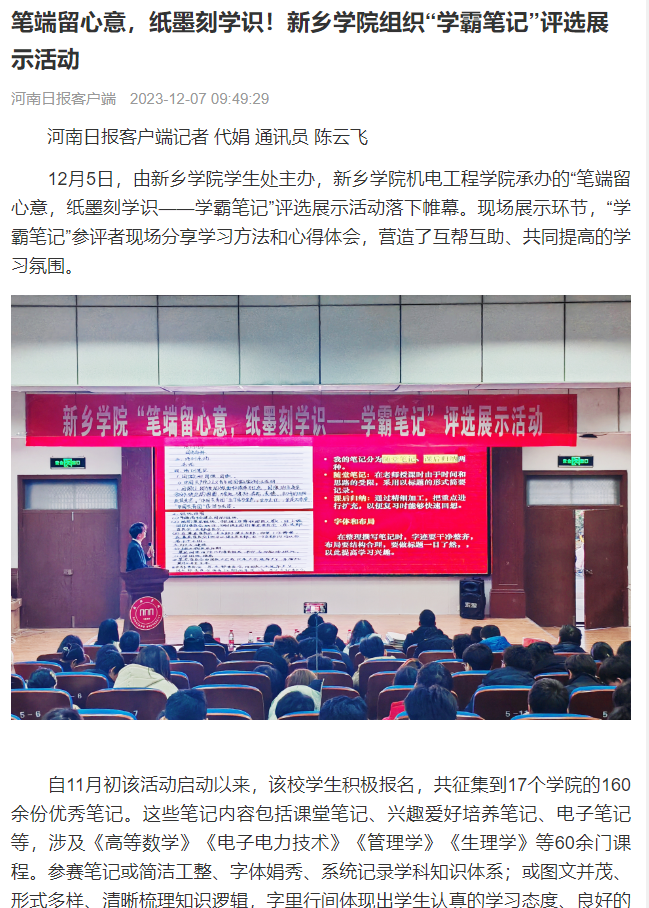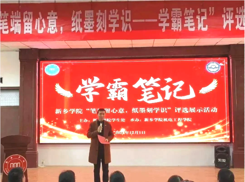 整个活动历时1个多月,在学生处领导及太阳集团网站8722党委书记张烨、院长贾蒙的指导下,经过个人报名、学院推荐、初赛评选,从参赛笔记的准确性、逻辑性、整洁性、创新性、规范性等多方面综合评审后,评选出25份优秀笔记进入到12月1日下午在A01报告厅举行的现场展示环节。太阳集团网站8722党委副书记陈云飞,副院长杜川,相关学院学工办主任、分团委书记、辅导员老师以及来自各学院的200余名学生到场参加。