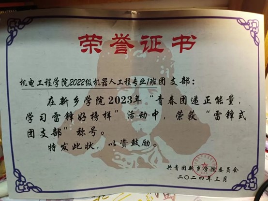 2022级机器人工程专业1班团支部,成立于2022年,团支部自成立以来,始终坚持以马克思列宁主义、毛泽东思想、邓小平理论、“三个代表”重要思想、科学发展观、习近平新时代中国特色社会主义思想为指导,认真贯彻落实团中央和上级团委的各项工作要求,积极开展各种形式的团组织活动,努力发挥团组织的桥梁纽带作用,为团员青年提供了展示才华、实现价值的舞台。同时也始终秉承着雷锋同志的奉献精神和集体主义精神,致力于在团员中弘扬雷锋精神,推动学雷锋活动的常态化,努力打造一支有信仰、有纪律、有担当的团员队伍。
