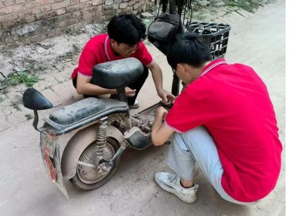 图为实践成员为村民维修电动车