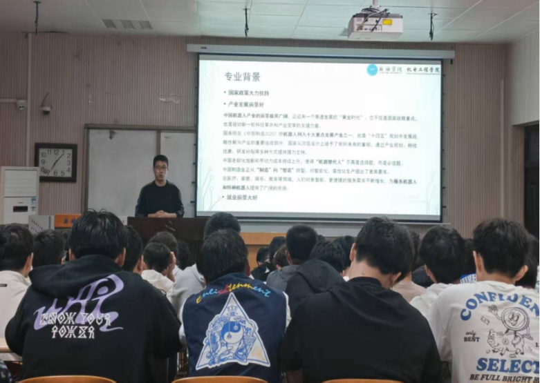 机器人工程教研室主任郎少庭以“专业-认知-生涯”三维度为机器人工程新生导航。首先从专业维度介绍机器人工程专业的发展背景、学习前景、毕业要求、课程分布,以及学院的师资力量与教学条件,帮助新生明确学习重点与发展方向;随后开展机器人认知教育,讲解机器人的定义、发展历史、分类及研究热点,激发新生专业学习热情;接着结合自身大学与研究生经历开展大学生涯教育,强调大学生活的丰富性与时间紧迫性,勉励新生兼顾多彩生活与专业学习,掌握核心技能。