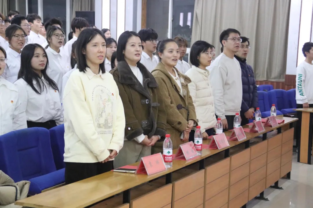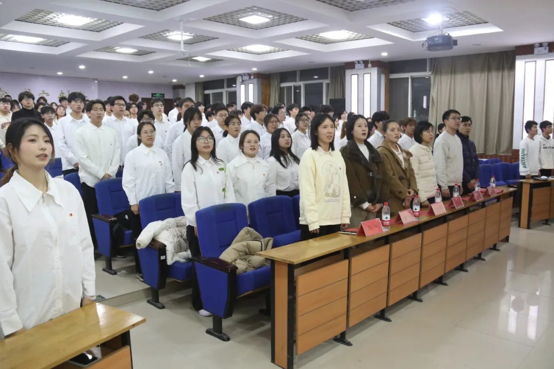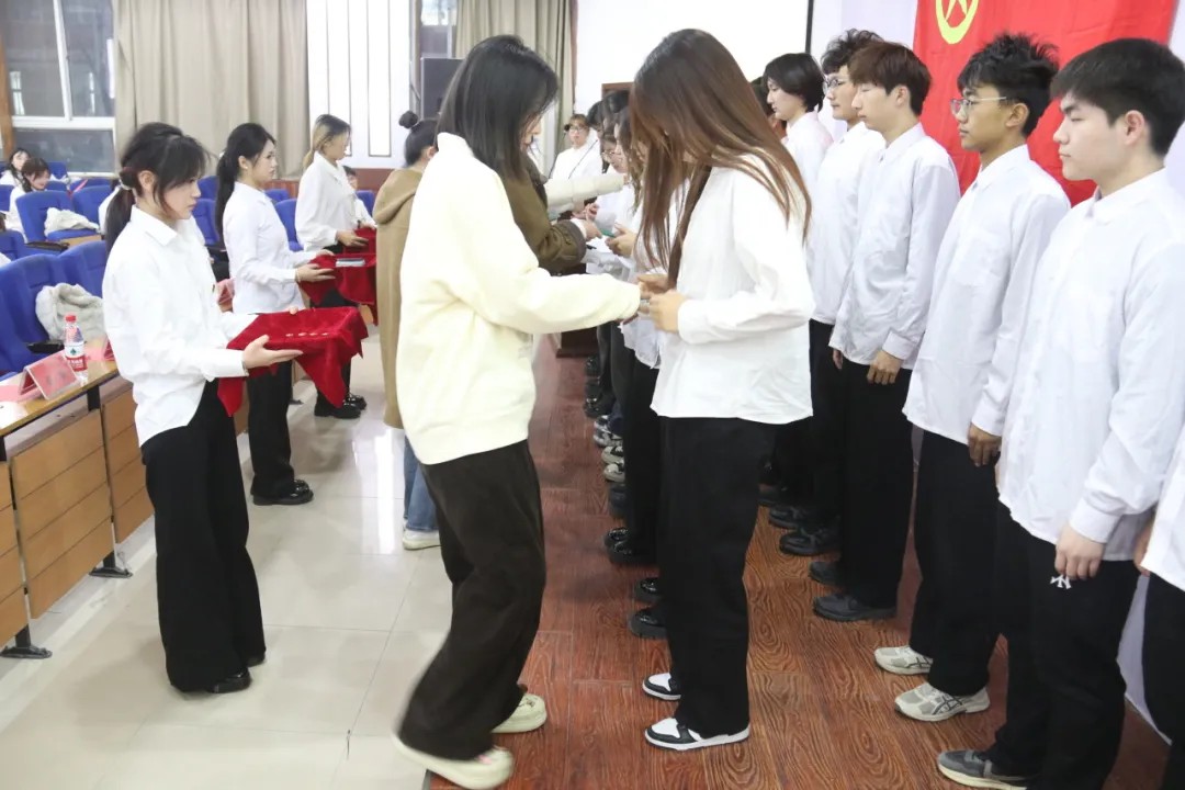 六个学院的老师为新发展团员佩戴团徽、分发团员证。中国共青团团徽由团旗、齿轮、麦穗、初升的太阳及其光芒,以及写有“中国共青团”五字的绶带组成。它象征着共青团在马克思列宁主义、毛泽东思想、习近平新时代中国特色社会主义思想的光辉照耀下,团结各族青年,朝着中国共产党所指引的方向奋勇前进。