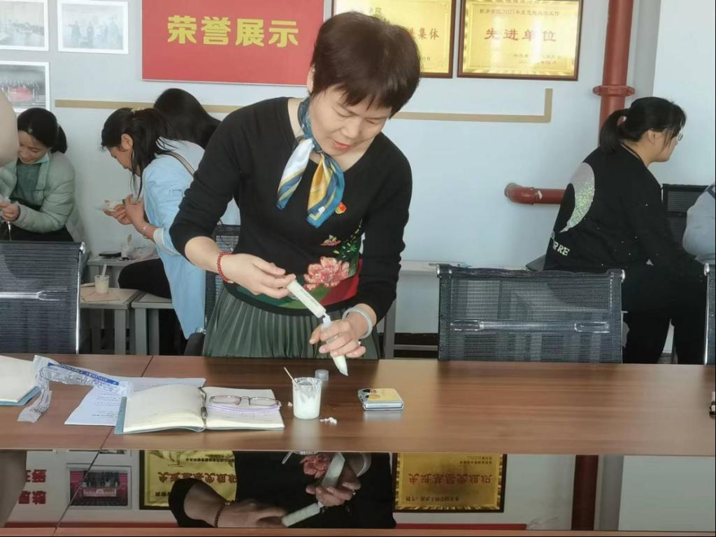 活动中,老师们按照操作方法将油、乳化剂、提取液等原料加入到量杯中不停搅拌,直至搅拌到无颗粒的状态之后,加入精油等其他原料,再次充分搅拌,最后用注射器把制作好的护手霜灌装进瓶子里。伴随着制作现场的一片欢声笑语,一支支滋润、醇香的护手霜制作完成。大家相互观摩、交流,享受着亲自动手的乐趣。完成制作后,老师们试用现场制作的护手霜,发现不管从吸收度还是滋润度,制作的效果都很好,不由得感到满满的自豪感。看着自己的劳动成果,每个人脸上都洋溢着灿烂的笑容。